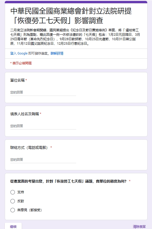中華民國全國商業總會針對立法院研提「恢復勞工七天假」影響調查
